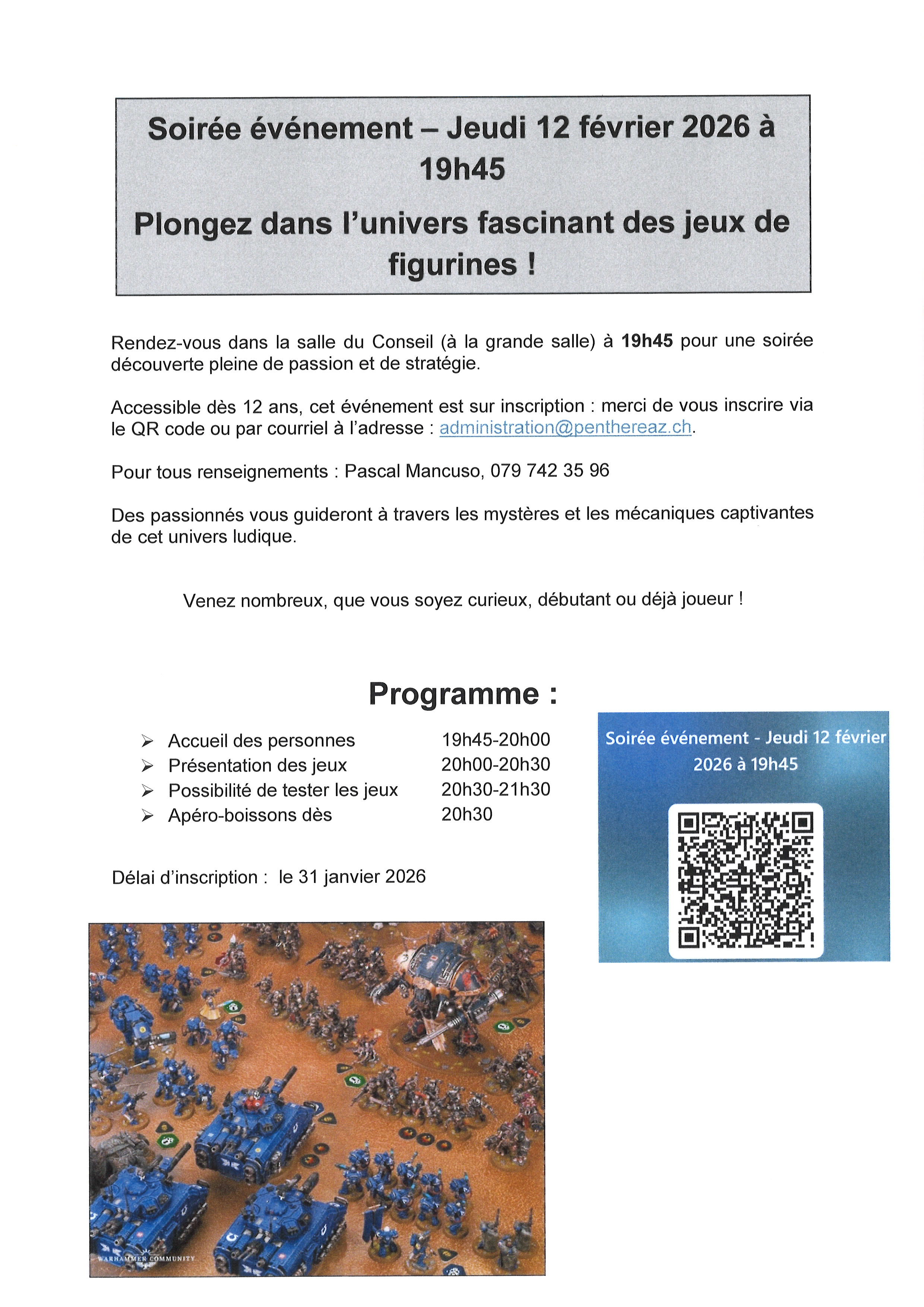 Soirée événement du jeudi 12 février 2026. Venez nombreux, que vous soyez curieux, débutant ou déjà joueur ! Plongez dans l'univers fascinant des jeux de figurines ! Inscription obligatoire.